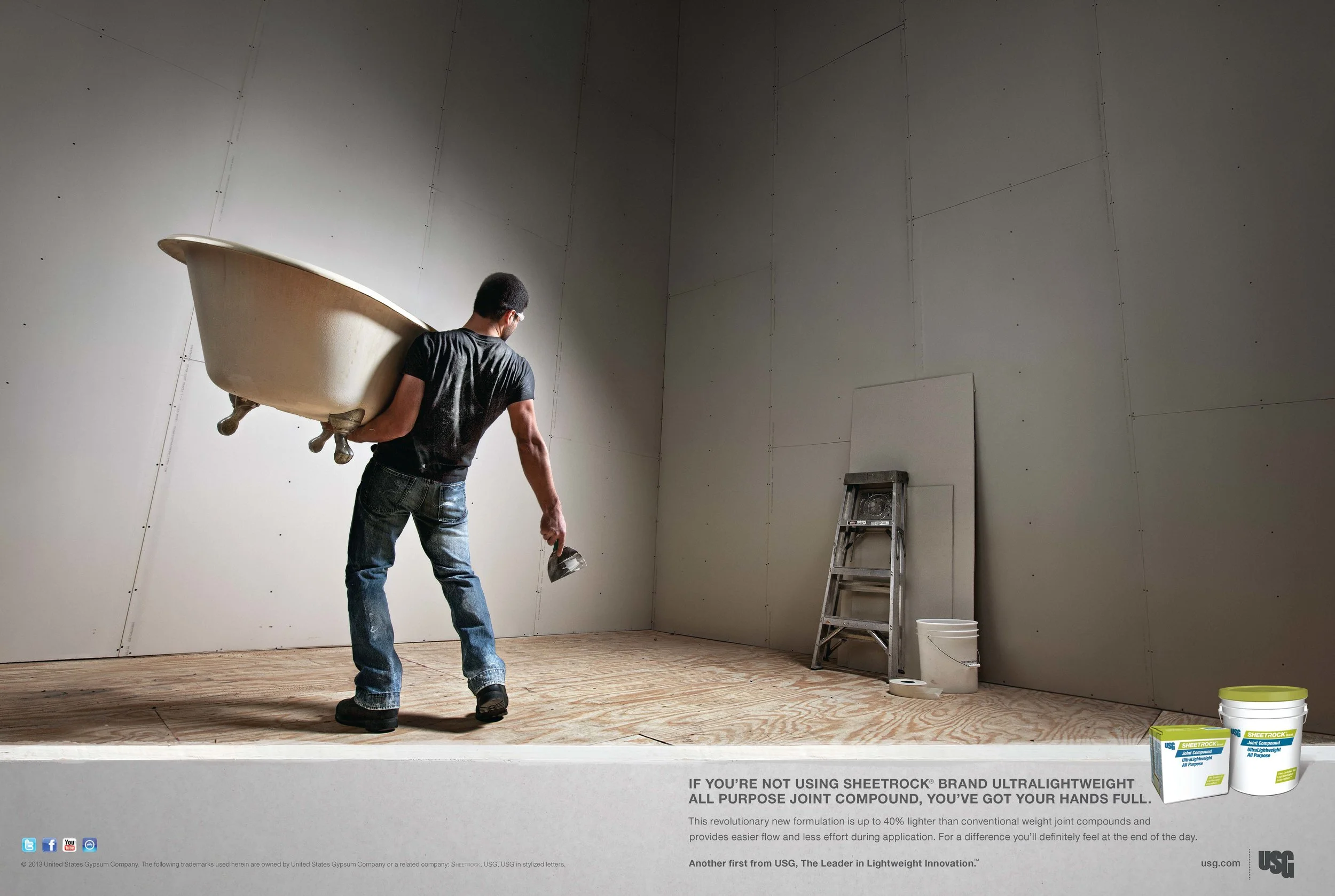 Body Copy: Up to 30% lighter, and stronger pound-for-pound than standard drywall, SHEETROCK® Brand Ultralight Panels take the weight out of the job, without taking the muscle out of the wall. USG is the only manufacturer to offer a complete lightweight portfolio. It’s the preferred choice for contractors and makes standard drywall seem, well, prehistoric. Another first from USG, the leader in lightweight innovation™. TheWeightHasBeenLifted.com